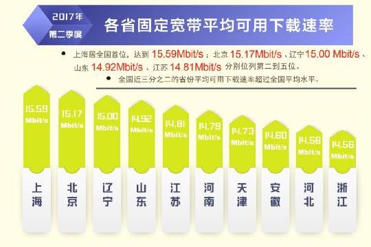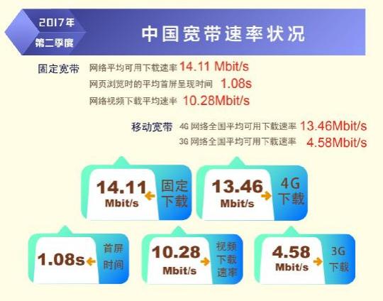 日前,寬帶發(fā)展聯(lián)盟發(fā)布了第 16 期《中國(guó)寬帶速率狀況報(bào)告》(2017 年第二季度)。報(bào)告顯示 2017 年第二季度我國(guó)固定寬帶網(wǎng)絡(luò)平均下載速率達(dá)到 14.11Mbit/s,比 2017 年第一季度提高了1.1Mbit/s,同比去年第一季度提升了 34.8%。自 2015 網(wǎng)絡(luò)“提速降費(fèi)”工作開展以來(lái),我國(guó)固定寬帶可用下載速率連續(xù) 10 個(gè)季度持續(xù)提升,總提升幅度達(dá)到 3.3 倍。同時(shí),我國(guó)移動(dòng)寬帶用戶使用 4G 網(wǎng)絡(luò)訪問(wèn)互聯(lián)網(wǎng)時(shí)的平均下載速率達(dá)到 13.46Mbit/s,環(huán)比 2017 年第一季度也有 14.2%的提升。